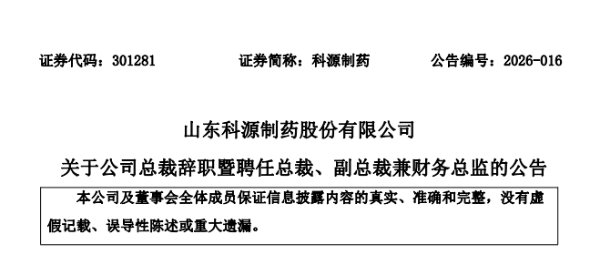 3月13日,科源制药发布公告称,山东科源制药股份有限公司董事会近日收到公司法定代表人、总裁高春坡先生的书面辞职报告,高春坡先生因工作调整原因申请辞去总裁职务,不再担任公司法定代表人,高春坡先生的原定任期至第四届董事会任期届满之日。高春坡先生辞去前述职务后不在公司担任其他职务。